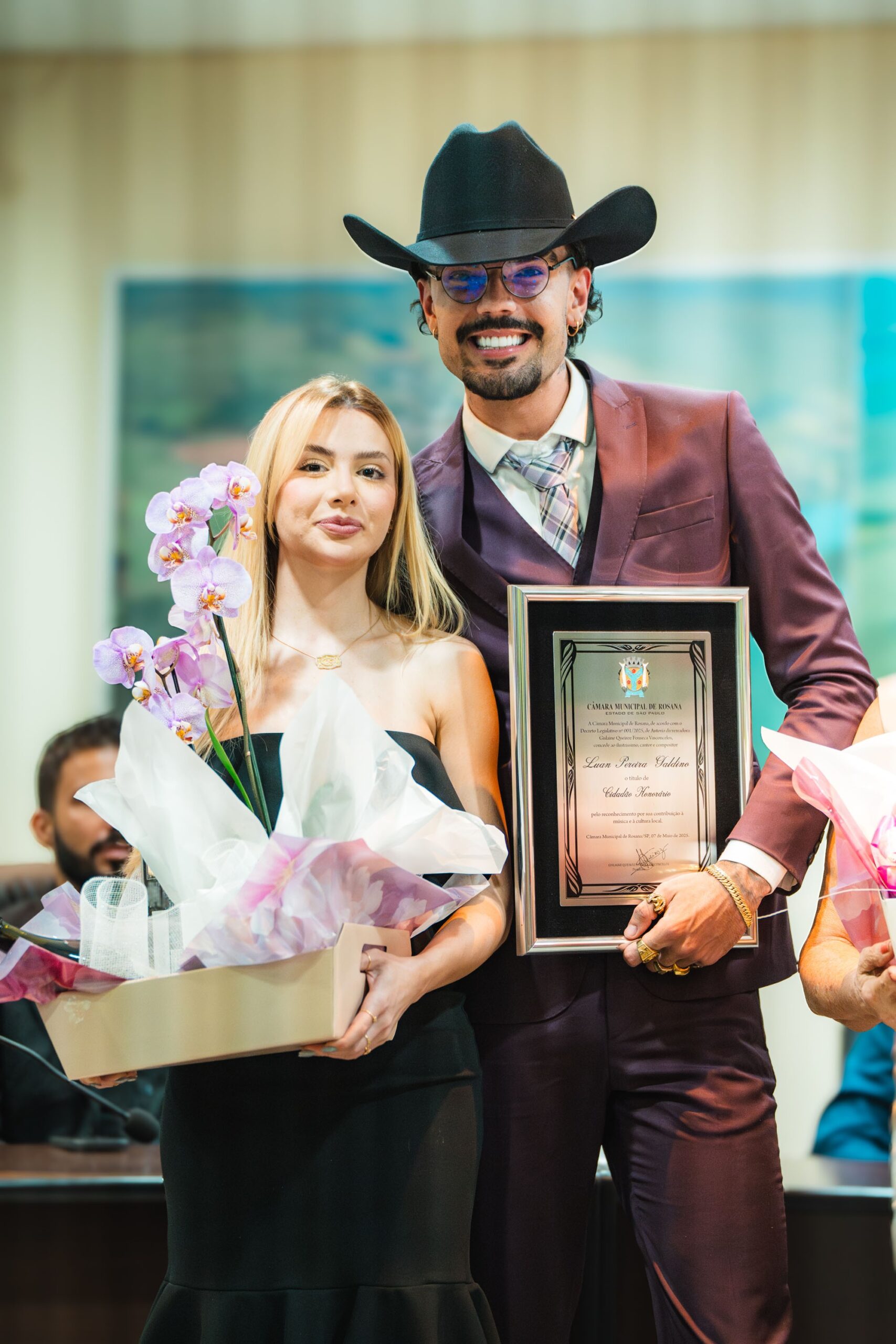 O cantor e compositor sertanejo Luan Pereira recebeu uma placa com o título de cidadão honorário de Rosana (SP) em uma sessão solene, nesta quarta-feira (7), na Câmara Municipal. A família e a noiva do artista também participaram da homenagem na cidade onde Luan morou por mais de dez anos, entre a infância e a adolescência, antes de se tornar o astro nacional que atualmente acumula mais de 22 milhões de seguidores nas redes sociais.