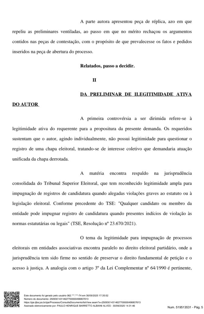 Segundo os autos, o então tesoureiro Antônio Jorge de Oliveira teria continuado a movimentar contas bancárias da associação mesmo após o afastamento formal, o que poderia contrariar as regras internas e comprometer a lisura do processo eleitoral.